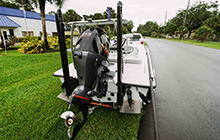 - Custom anodized aluminum and stainless steel trailer w/spare tire, LED lights, and 12” wide custom walk board